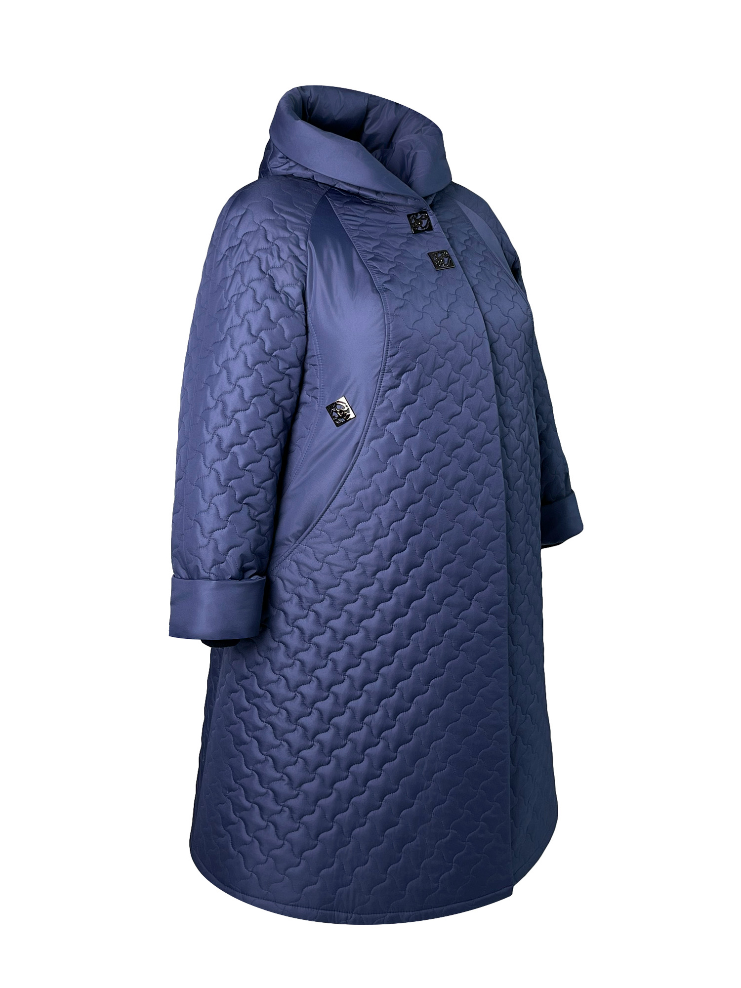 Пальто женское зимнее из стеганной плащевой ткани модного геометрического рисунка синего цвета. Приятный мягкий капюшон создает женственный романтичный образ. Пальто силуэта трапеция свободного покроя. Рукав реглан с манжетой и мягким трикотажным напульсником. Вертикальные рельефы и комфортная длина помогают скрыть недостатки фигуры и визуально вытянуть силуэт. Карманы в шве декорированы кнопками. Застежка на супатке и кнопках.