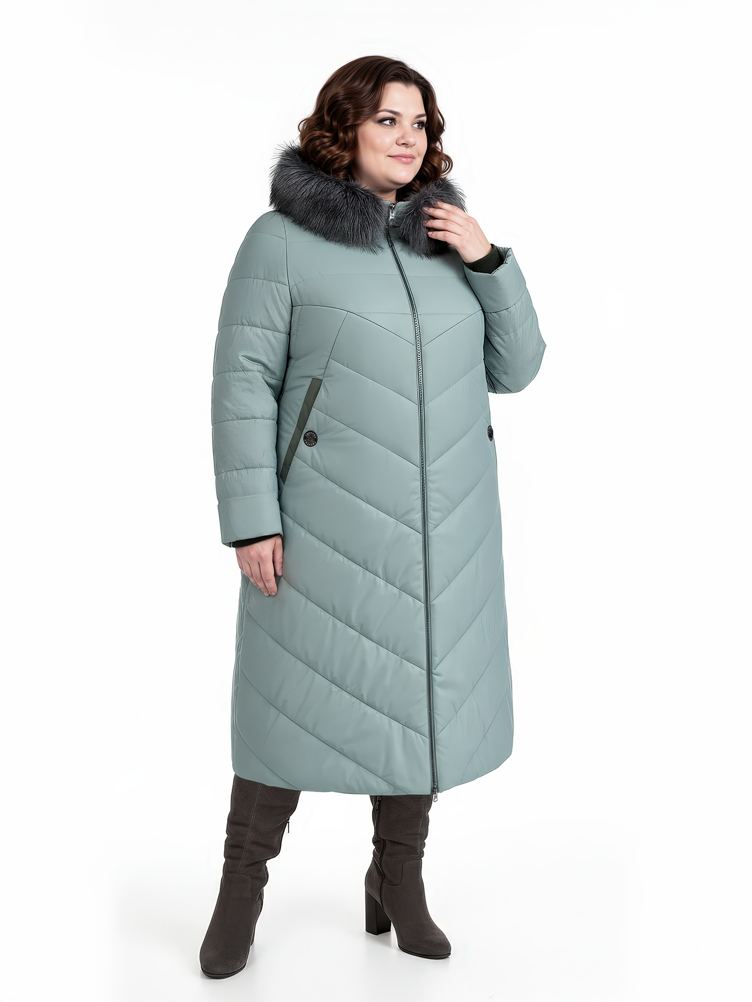 Интересное женское пальто из комбинированной стеганой ткани мятного цвета с зеленой отделкой. Модель выглядит современно за счет трапециевидного силуэта, обеспечивающего хорошую посадку по фигуре. Большой комфортный капюшон оформлен эко-мехом чернобурки. В модели установлены высококачественные профессиональные молнии из Японии. Бренд YKK изготавливает их по нашему заказу для каждого изделия. Мы настолько уверены в качестве наших молний, что даем на них гарантию 25 лет. Карман в шве, с брендированной кнопкой и вставкой. Рукав полуреглан с мягкой манжетой по низу и трикотажным напульсником. На этой модели применена ручная вырезка и подгонка рисунка стежки на деталях полочек и спинки. Это делает процесс изготовления более трудоемким, и при этом каждое изделие выполнено индивидуально. Такая технология позволяет располагать стежку не горизонтально, как у большинства производителей, а по диагонали, что делает модель привлекательней.