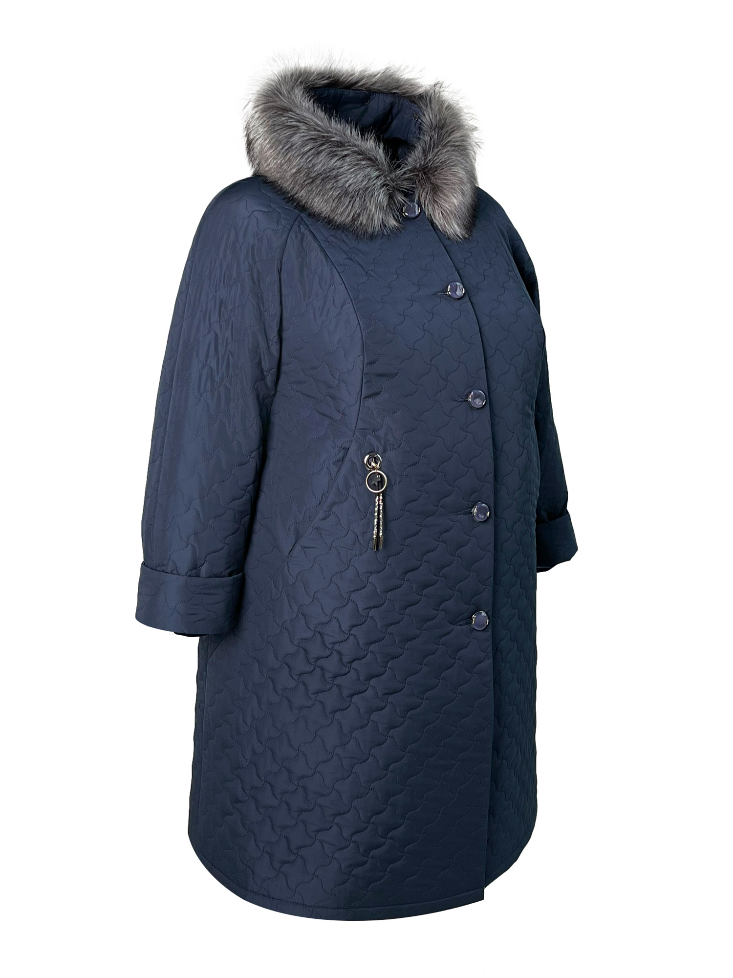 Женское зимнее пальто из стеганной плащевой ткани синего цвета. Благодаря практичности и универсальности этот вид пальто давно стал популярным. Оригинальные лекала гарантируют комфортную посадку по фигуре. Свободный силуэт трапеция даст естественность и непринужденность в ношении. Вертикальные рельефы скорректируют фигуру и визуально вытянут. Застежка на пуговицы. Карман в рельефе с декоративной подвеской на одну сторону. Отделка капюшона из эко-меха чернобурки. Длина миди (до середины икры). Подкладка пальто дополнительно утеплена Альполюксом. Модель подходит для всех типов фигур и легко сочетается с любым вариантом одежды, будь то платье, юбка или брюки.