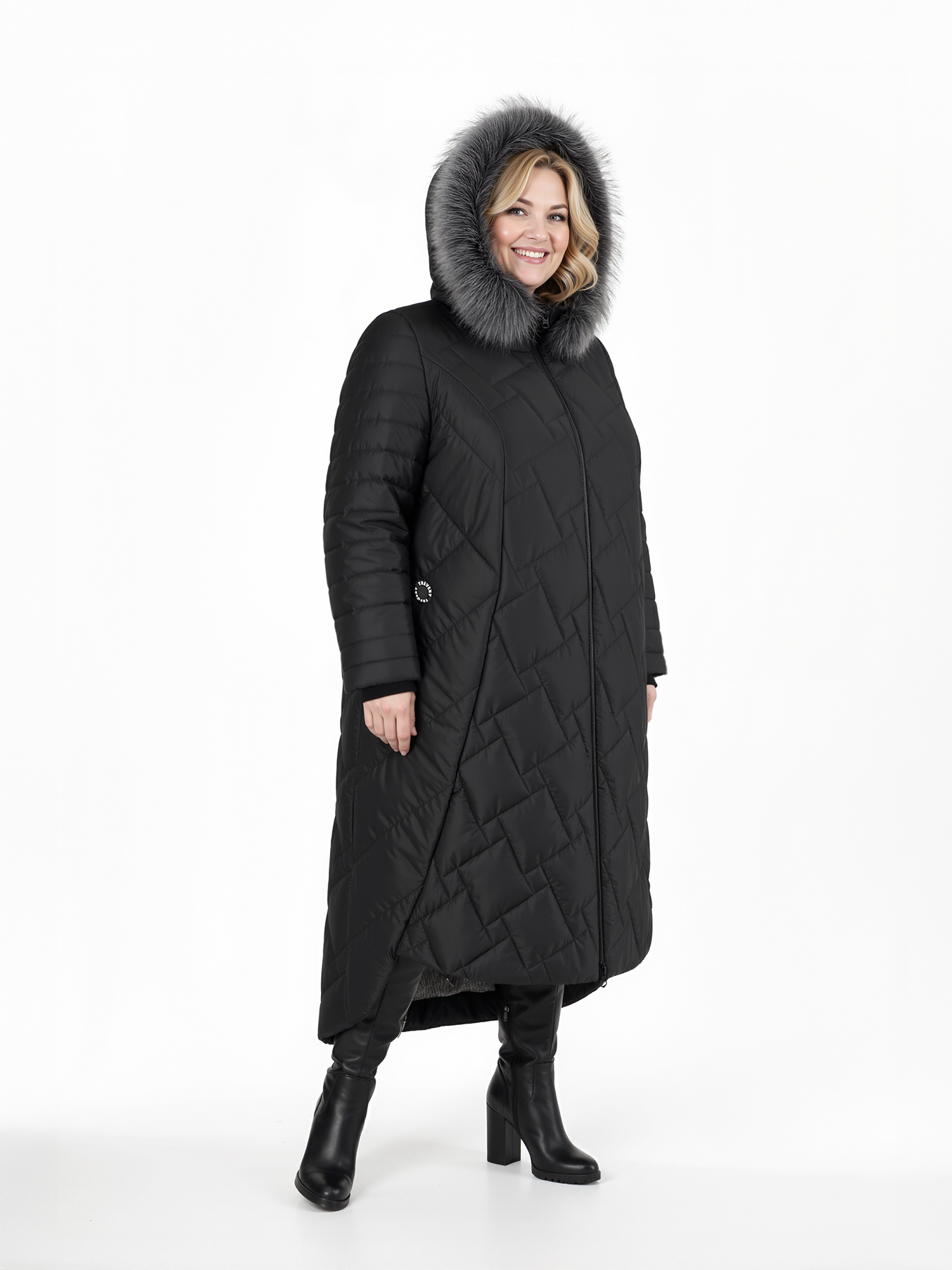 Интересное молодежное зимнее пальто из красивой комбинированной стеганной ткани черного цвета. Модель выглядит современно за счет прямого силуэта, обеспечивающего хорошую посадку по фигуре. Большой комфортный капюшон в виде стойки с эко-мехом чернобурки, хорошо защищает от непогоды. Рукав полуреглан с трикотажным напульсником. Карманы в шве с брендированной кнопкой. Спинка и полочка асимметричны по длине. На этой модели применена ручная вырезка и подгонка рисунка стежки на деталях. Это делает процесс изготовления более трудоемким, и при этом каждое изделие выполнено индивидуально. Такая технология позволяет располагать стежку не горизонтально, как у большинства производителей, а по диагонали, что делает модель привлекательней.