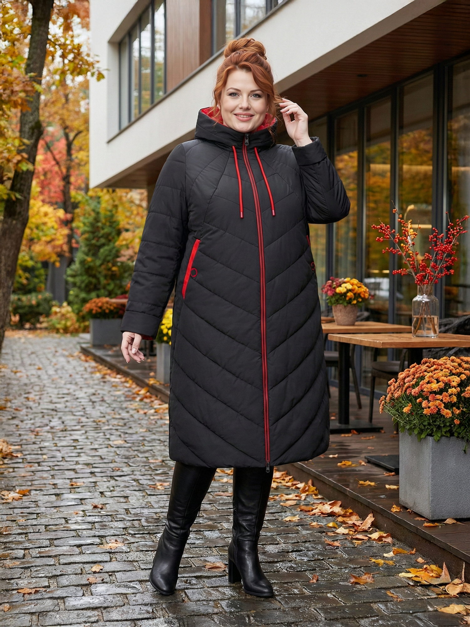Пальто больших размеров с капюшоном, модель 93723 в цвете черный с красным