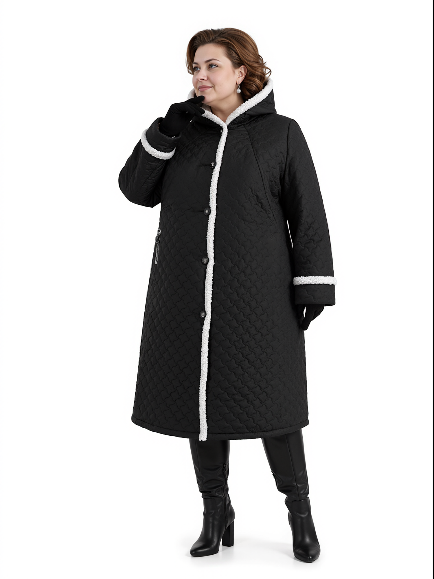 Уважаемые покупатели! Мы упростили выбор — для каждого артикула указаны параметры груди и бёдер. Ориентируйтесь на объём груди, затем проверьте, входит ли ваш ОБ в диапазон, указанный рядом с нужным размером. Если нет — фасон вам не подойдет, выберите другой. Наши конструкторы разрабатывают одежду для разных типов фигур, и вы обязательно найдёте подходящий вариант. Этот фасон идеален для фигуры с разницей ОБ и ОГ 18 см. Длина по спинке 117 см. Также можно сверить мерки своего пальто с таблице промеров готового изделия. Если не уверены — отправьте рост, ОГ и ОБ, подскажем правильный размер. Отвечаем быстро — в течение дня. Это поможет сделать точный выбор и избежать лишней пересылки. Женское зимнее пальто большого размера — стильное и практичное решение для холодной погоды до -25℃. Удлиненная теплая модель с капюшоном создана специально для полных женщин и отличается продуманным кроем реглан и комфортной посадкой. А-силуэт в форме трапеции и длина ниже колена визуально стройнят фигуру и обеспечивают свободу движений. Это длинное стеганое пальто застегивается на пуговицы и идеально подойдёт на зиму. Классическое исполнение с мехом сочетается с модным дизайном и красивыми расцветками, делая эту утепленную модель универсальной частью гардероба. Такая верхняя одежда на синтепоне — это проверенная классика для тех, кто любит комфорт, актуальные тенденции и практичность. Она подчеркнёт вашу индивидуальность и привлечёт внимание окружающих. Наше качество радует годами и заслуживает вашего доверия. Отзывы с превосходными оценками помогут определиться с заказом. Чтобы не пропустить новые коллекции 2025–2026 плюс сайз, нажмите на логотип Trevery и добавьте наш сайт в избранное. Приятных покупок!