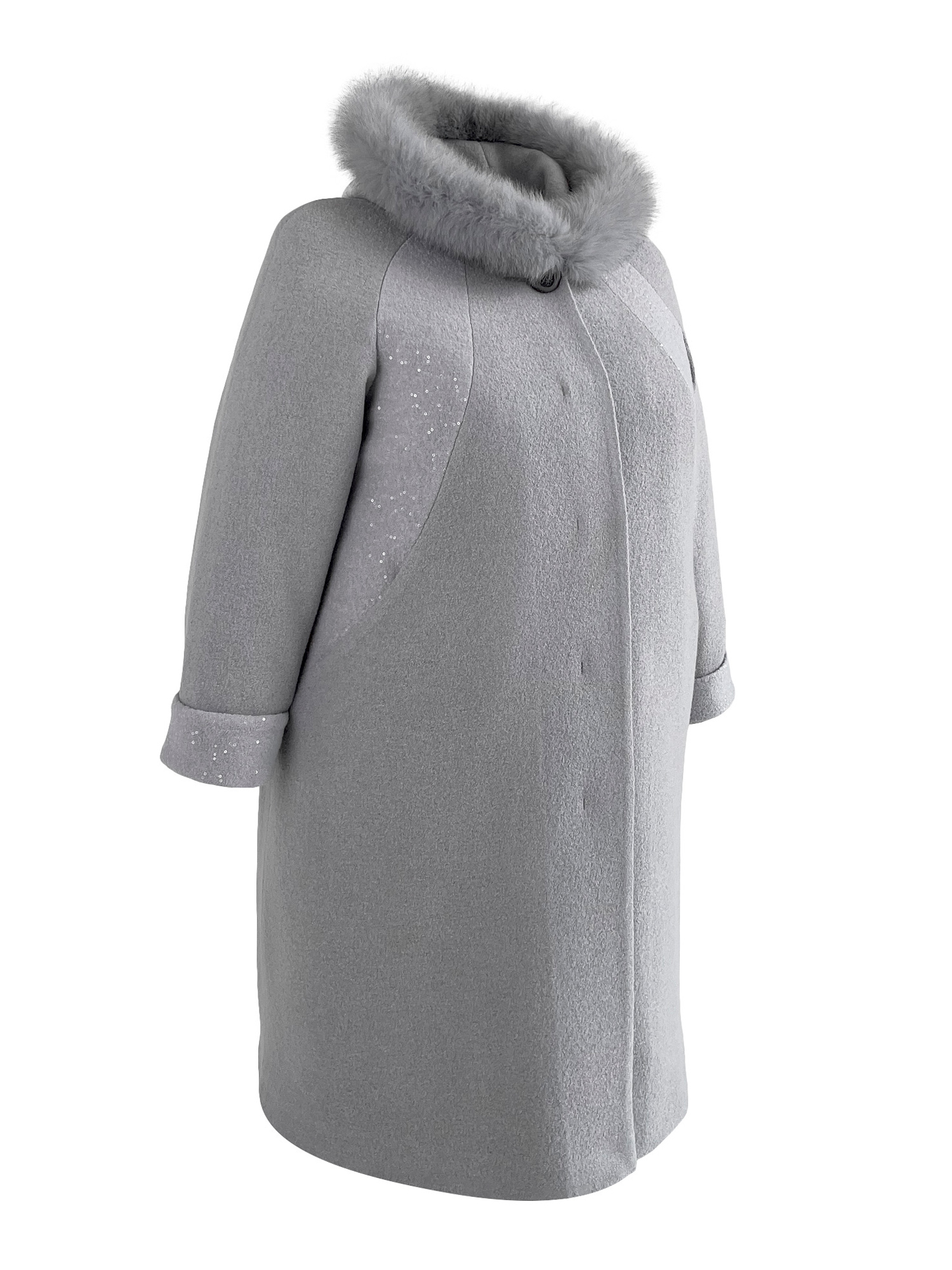 Зимнее женское пальто из драпа силуэта трапеция. Сказочное мерцание пайеток на отделке большого мягкого капюшона, отворотов рукавов и бочков создает женственный романтичный образ. Капюшон оформлен пушистым песцом. Свободный покрой, вертикальные рельефы, карманы в шве и удобная длина визуально вытягивают силуэт. Застежка на декоративные кнопки и супату дополнительно украшают модель и не оставят незамеченной свою обладательницу.