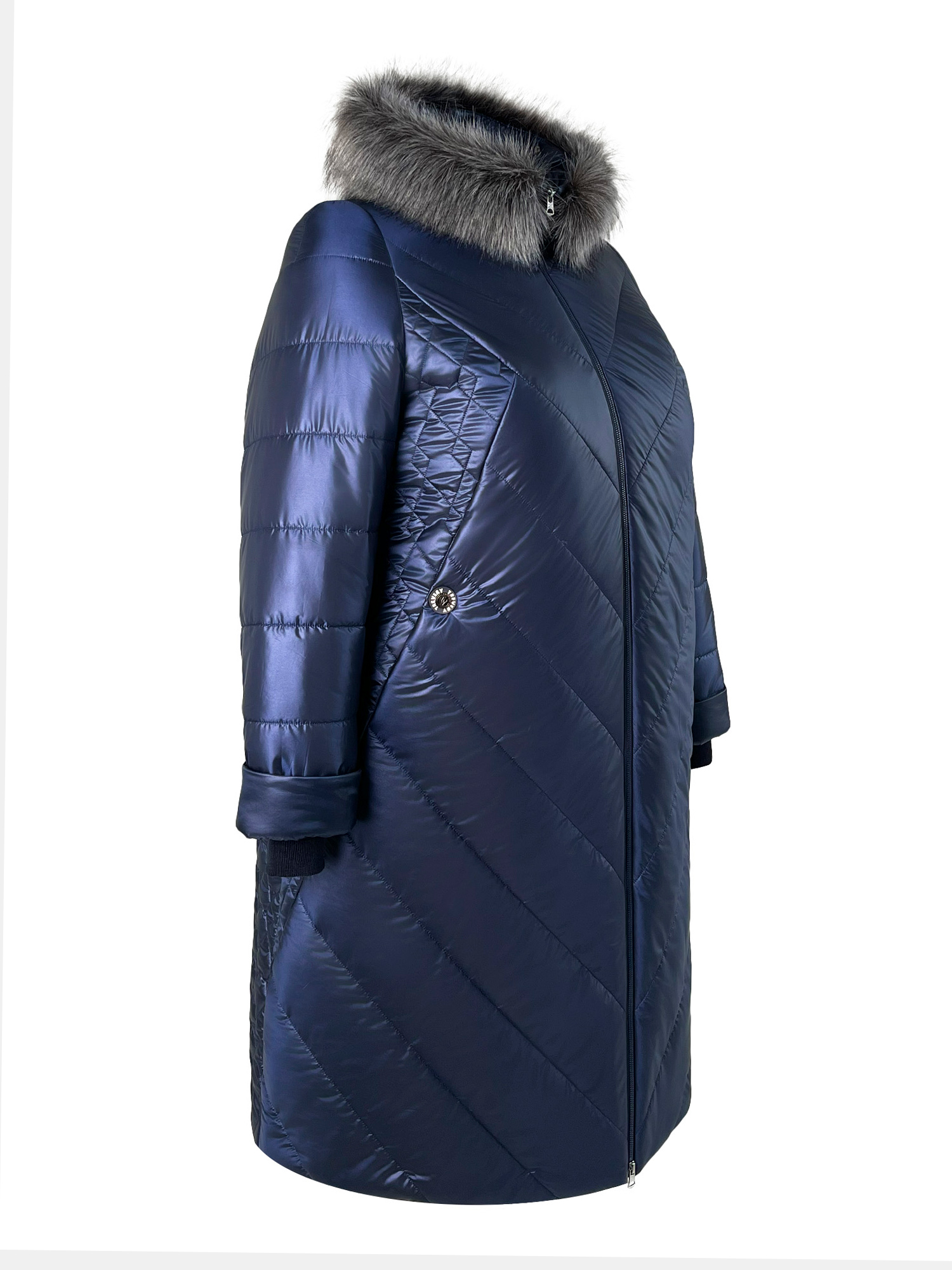 Интересное женское пальто из комбинированной стеганой ткани роскошного синего цвета. Модель выглядит современно за счет трапециевидного силуэта, обеспечивающего хорошую посадку по фигуре. Большой комфортный капюшон в виде стойки с эко-мехом чернобурки, защищает от непогоды. В модели установлены высококачественные профессиональные молнии из Японии. Бренд YKK изготавливает их по нашему заказу для каждого изделия. Мы настолько уверены в качестве наших молний, что даем на них гарантию 25 лет. Карман в шве, с брендированной кнопкой. Рукав полуреглан с трикотажным напульсником по низу. На этой модели применена ручная вырезка и подгонка рисунка стежки на деталях полочек и спинки. Это делает процесс изготовления более трудоемким, и при этом каждое изделие выполнено индивидуально. Такая технология позволяет располагать стежку не горизонтально, как у большинства производителей, а по диагонали, что делает модель привлекательней.