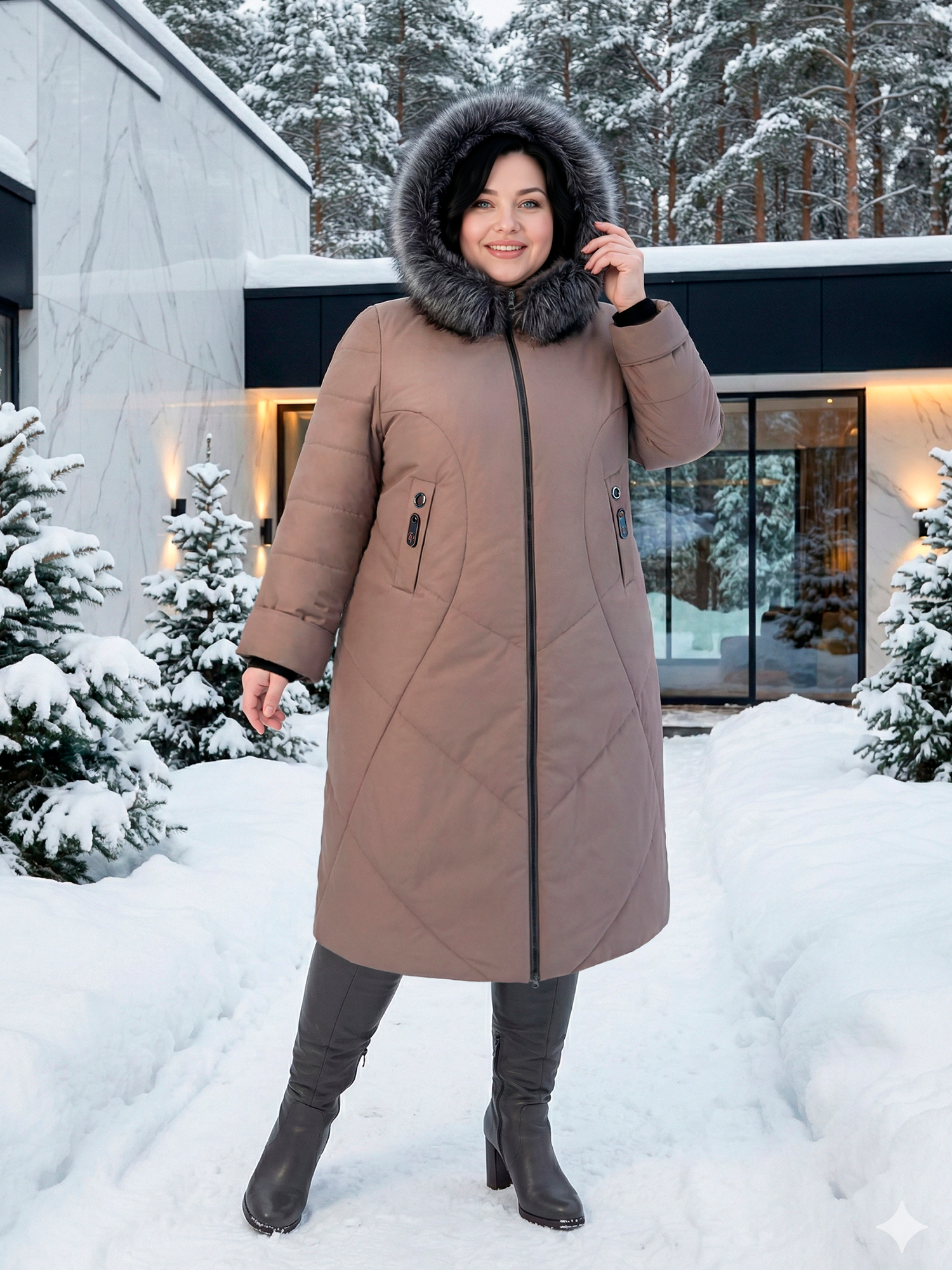 Уважаемые покупатели! Мы упростили выбор — для каждого артикула прописаны параметры груди и бедер. Ориентируйтесь на объем груди, затем проверьте, входит ли ваш ОБ в диапазон, указанный рядом с нужным размером. Если нет — фасон вам не подойдет, выберите другой. Наши конструкторы разрабатывают модели для разных фигур, и вы обязательно найдете подходящий вариант. Этот фасон идеален для фигуры с разницей ОБ и ОГ 16 см. Также можно сверить мерки своего пальто с таблице промеров готового изделия. Если не уверены, отправьте рост, ОГ и ОБ — мы подскажем правильный размер. Отвечаем быстро, в течение дня. Так вы получите максимально точное попадание и избежите лишней пересылки. Пуховик женский зимний больших размеров — это сочетание практичности и продуманного кроя. Удлиненная модель выполнена в виде А-силуэта и повторяет форму трапеции, что делает фигуру визуально стройнее. Длина ниже колен обеспечивает надежную защиту в холодную зиму. Этот длинный пуховик сшит специально для полных женщин, учитывая особенности фигуры и потребности. Незаменимый реглан добавляет свободы в движении и удобства в носке. Длина по спинке 107 см. Модная модель украшена капюшоном с мехом чернобурки, который гармонично сочетается с общим стилем. Прочная молния с брендовым замком YKK не подведет в любой мороз. Утепленный пуховик на современном синтепоне обеспечит комфорт в суровую погоду. Такая красивая и теплая верхняя одежда впишется в ваш гардероб. Ее можно носить как в городе, так и на прогулке — она универсальна и подходит для любой ситуации. В ней сочетаются стильный дизайн и классическое исполнение, делая ее настоящей классикой. Подчеркните свою индивидуальность с этим жен пальто — стеганое, элегантное, с акцентом на детали и безупречную посадку. Отзывы с превосходными оценками помогут вам определиться с заказом. Чтобы не пропустить новые коллекции 2025 2026 плюс сайз, нажмите на логотип Trevery и добавьте наш сайт в избранное. Приятных покупок!