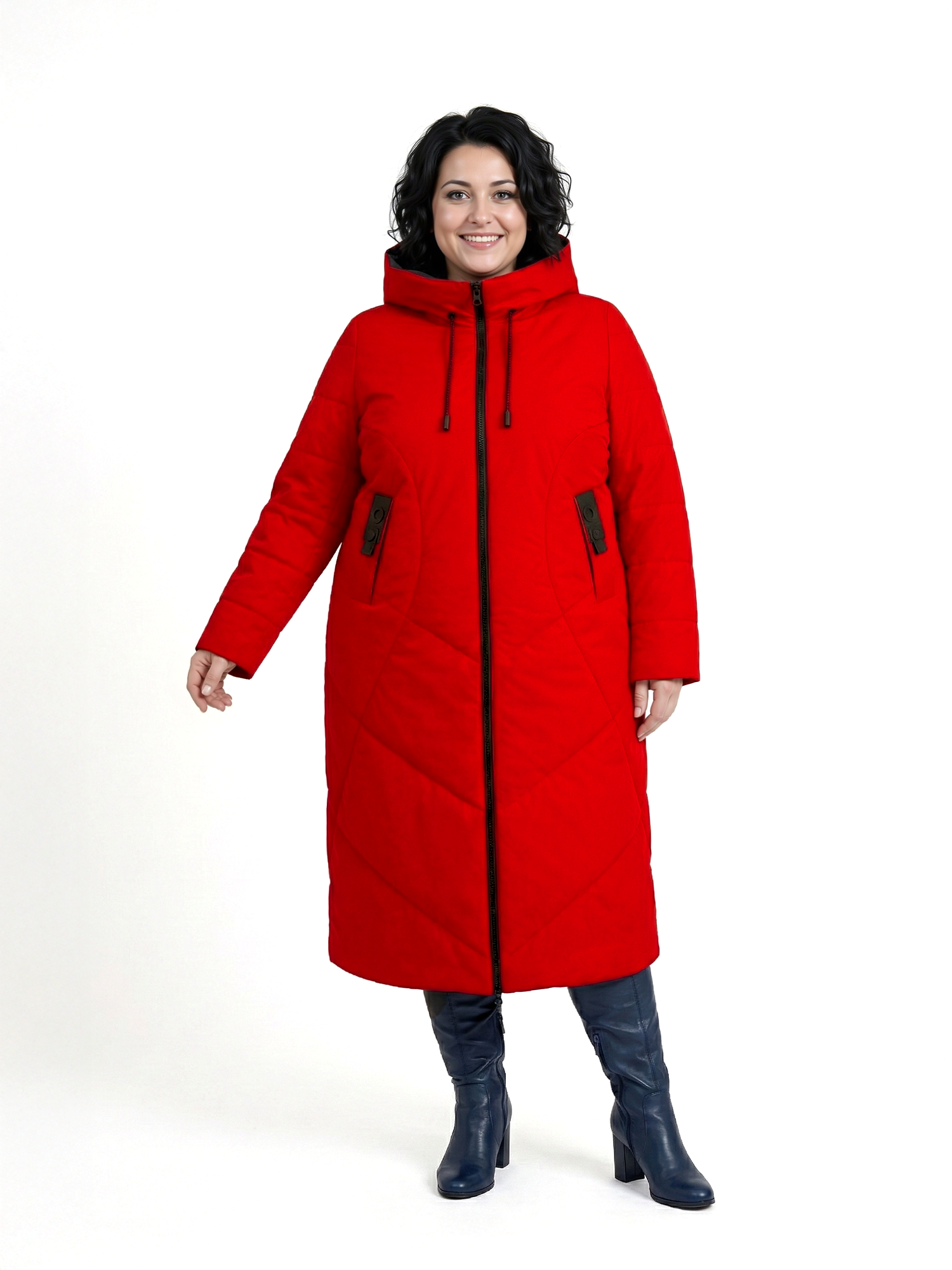Пальто больших размеров с капюшоном, цвет красный в интернет-магазине Фабрики Тревери