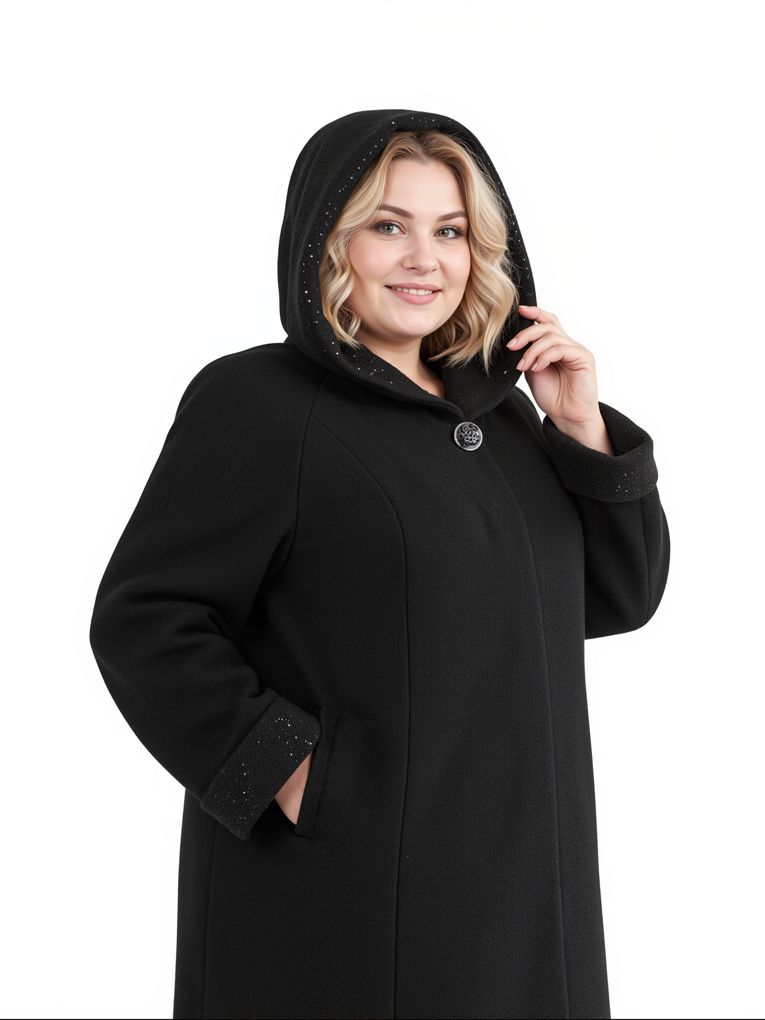 Пальто женское из драпа силуэта трапеция. Сказочное мерцание пайеток на отделке большого мягкого капюшона и отворотов рукавов создает женственный романтичный образ. Свободный покрой, вертикальные рельефы и удобная длина помогают скрыть недостатки фигуры и визуально вытянуть силуэт. Карманы прорезные с листочкой.