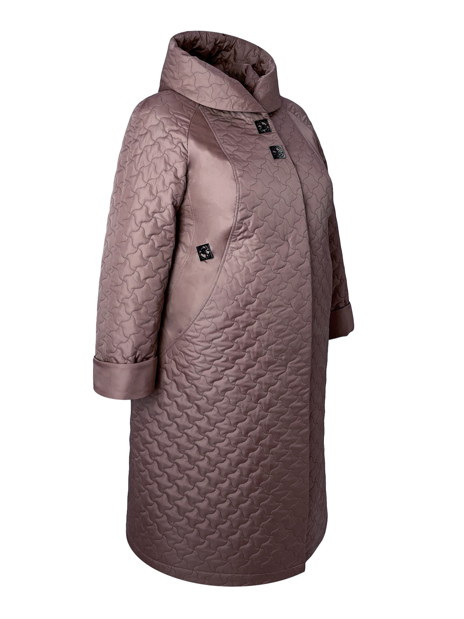 Пальто женское из стеганной плащевой ткани модного геометрического рисунка кофейного цвета. Приятный мягкий капюшон создает женственный романтичный образ. Пальто силуэта трапеция свободного покроя. Рукав реглан с манжетой. Вертикальные рельефы и комфортная длина помогают скрыть недостатки фигуры и визуально вытянуть силуэт. Карманы в шве декорированы кнопками. Застежка на супатке и кнопках.