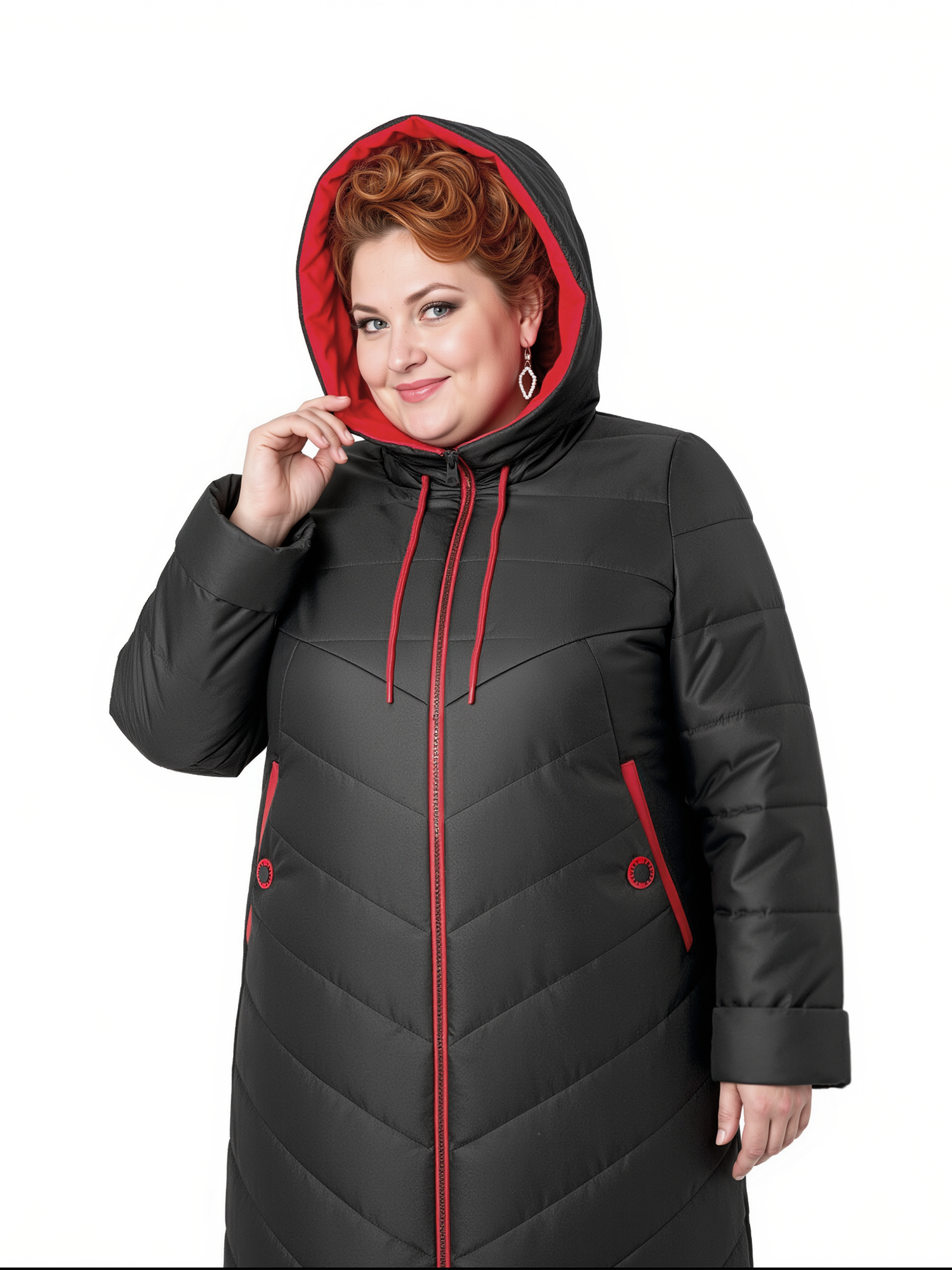 Интересное женское пальто из комбинированной стеганой ткани черного цвета с красной отделкой. Модель выглядит современно за счет трапециевидного силуэта, обеспечивающего хорошую посадку по фигуре. Большой комфортный капюшон с шнуровкой и нашивкой. В модели установлены высококачественные профессиональные молнии из Японии. Бренд YKK изготавливает их по нашему заказу для каждого изделия. Мы настолько уверены в качестве наших молний, что даем на них гарантию 25 лет. Карман в шве, с брендированной кнопкой и вставкой. Рукав полуреглан с мягкой манжетой по низу. На этой модели применена ручная вырезка и подгонка рисунка стежки на деталях полочек и спинки. Это делает процесс изготовления более трудоемким, и при этом каждое изделие выполнено индивидуально. Такая технология позволяет располагать стежку не горизонтально, как у большинства производителей, а по диагонали, что делает модель привлекательней.