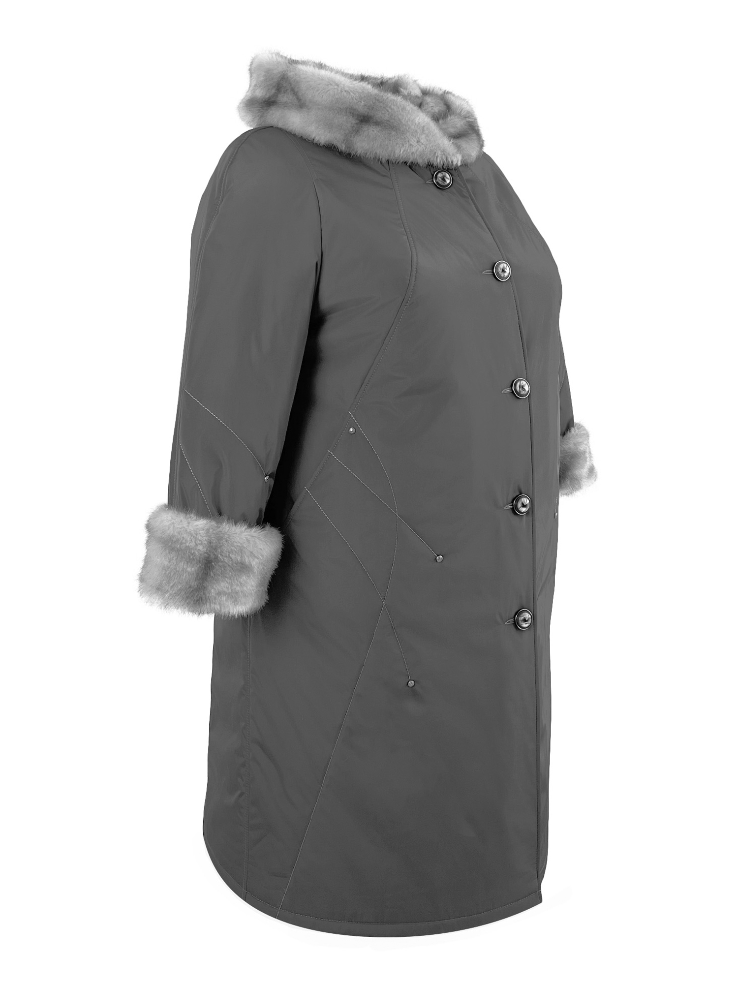 Пальто женское зимнее цвета серый на утеплителе «Альполюкс». Благодаря практичности и универсальности этот вид пальто давно стал популярным. Оригинальные лекала гарантируют комфортную посадку по фигуре. Свободный силуэт трапеция даст естественность и непринужденность в ношении. Вертикальные рельефы скорректируют фигуру и визуально вытянут. Эффектность модели придают фигурные отделочные строчки с зафиксированными хольнитенами. Отделка капюшона и отворотов рукавов из экомеха, имитирующего полу норку в цвет ткани. Длина миди (до середины икры). Модель подходит для всех типов фигур и легко сочетается с любым вариантом одежды, будь то платье, юбка или брюки.